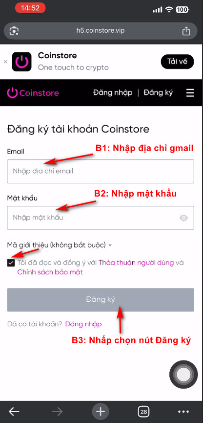 Bước 2: Đăng ký tài khoản Coinstore