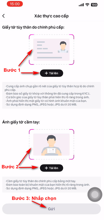 _ Tiếp theo Quý khách cầm giấy tờ tùy thân trước ngực và chụp hình khuôn mặt đang cầm giấy tờ tùy thân rồi tải lên hệ thống.
