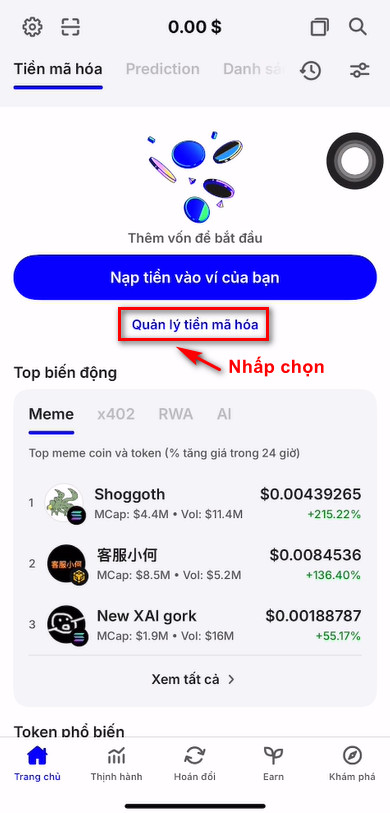 _ Ở trang chính của Ví, quý khách nhấp chọn chữ Quản lý tiền mã hóa