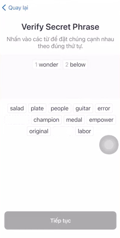 _ Ứng dụng sẽ yêu cầu Quý khách nhập lại hoặc chọn lại các cụm từ theo đúng thứ tự quý khách vừa sao lưu.