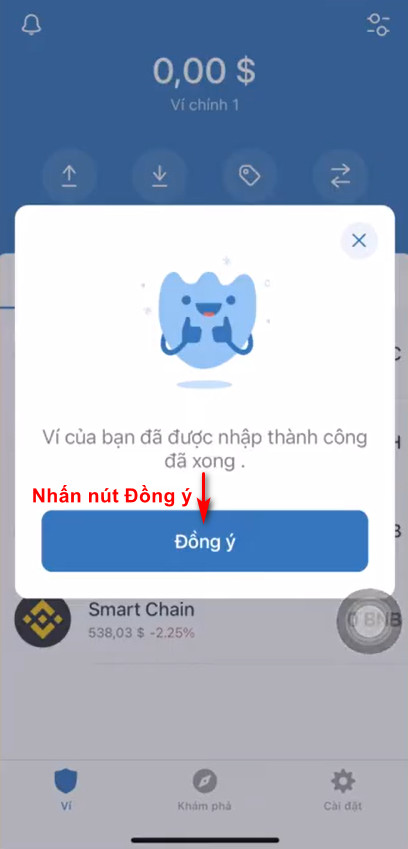 _ Nếu xác minh thành công, Quý khách sẽ nhận được thông báo: Ví của bạn được nhập thành công và được chuyển đến giao diện chính của ví.