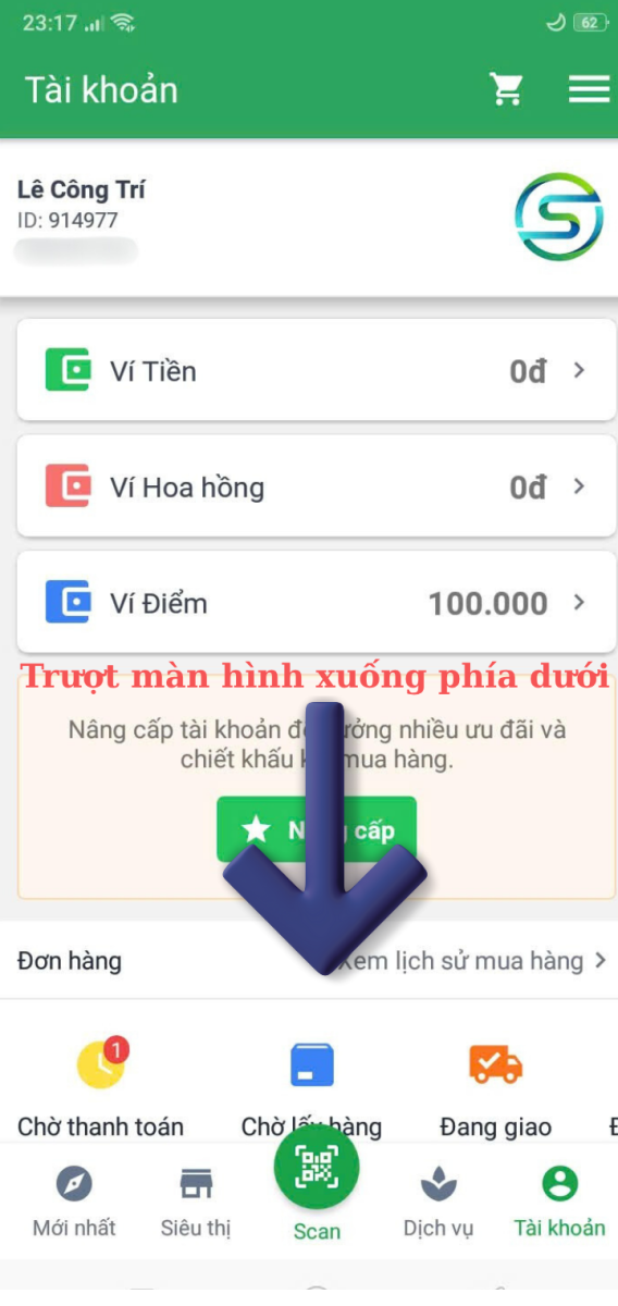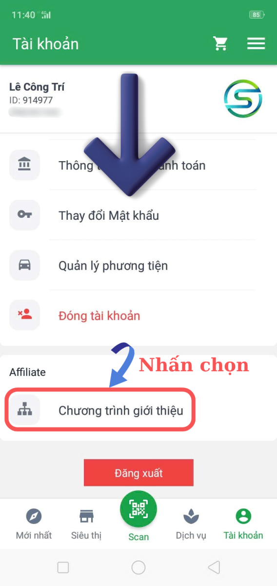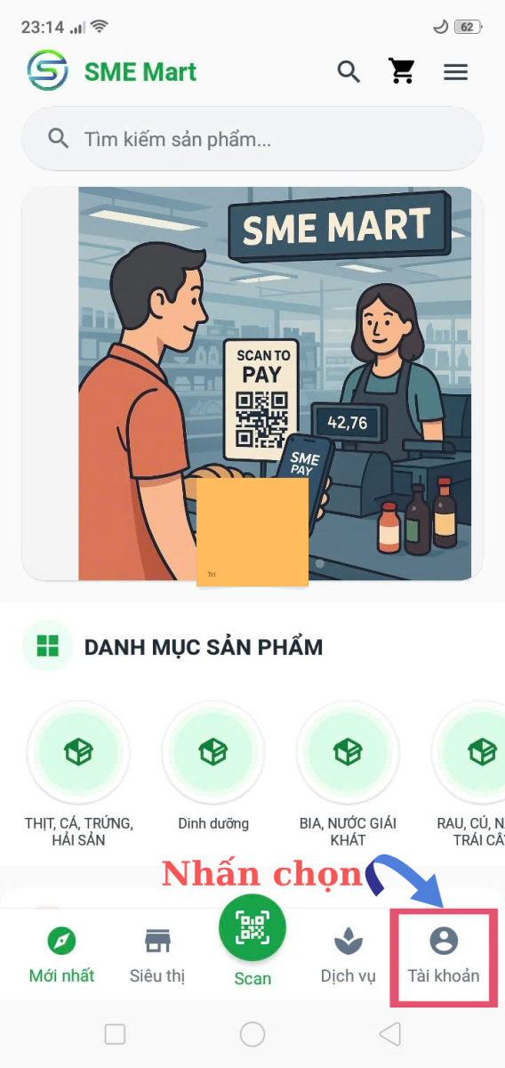 Bước 1: Đăng nhập vào ứng dụng SME Mart, Chọn mục Tài khoản